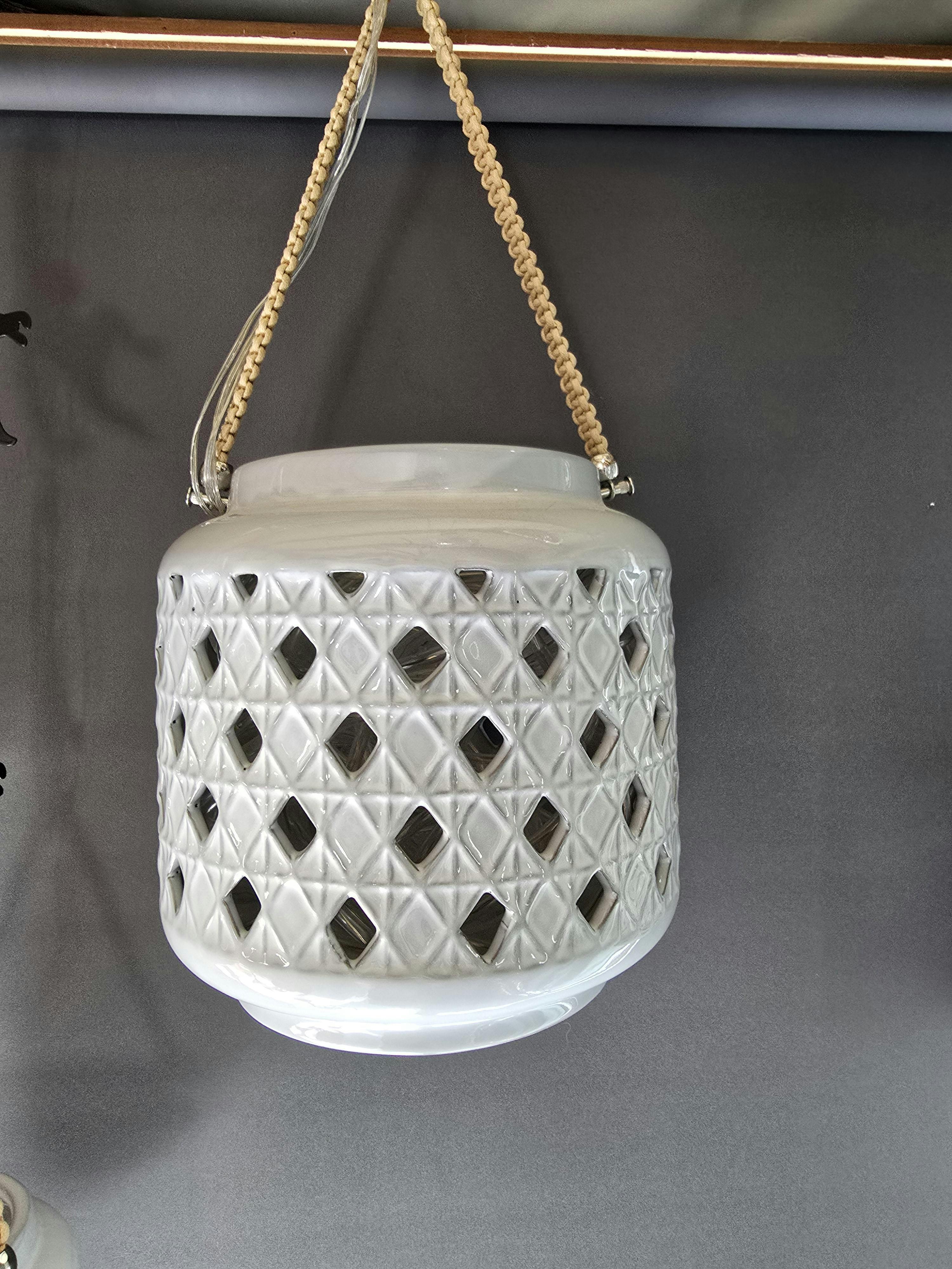 Large gray stone lantern with a diamond pattern. It will illuminate your interior in a trendy way. Its flexible woven cotton handle makes it easy to carry. The soft light will create a warm atmosphere both outdoors and indoors. It will blend perfectly into a pastel or natural decor.