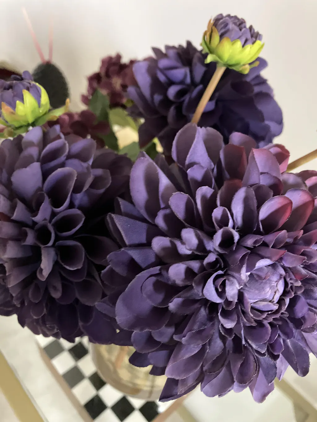 Artificial Dahlia stem with leaves and a bud. The dahlia will bring a romantic and understated touch to your interior with its generous flower head.