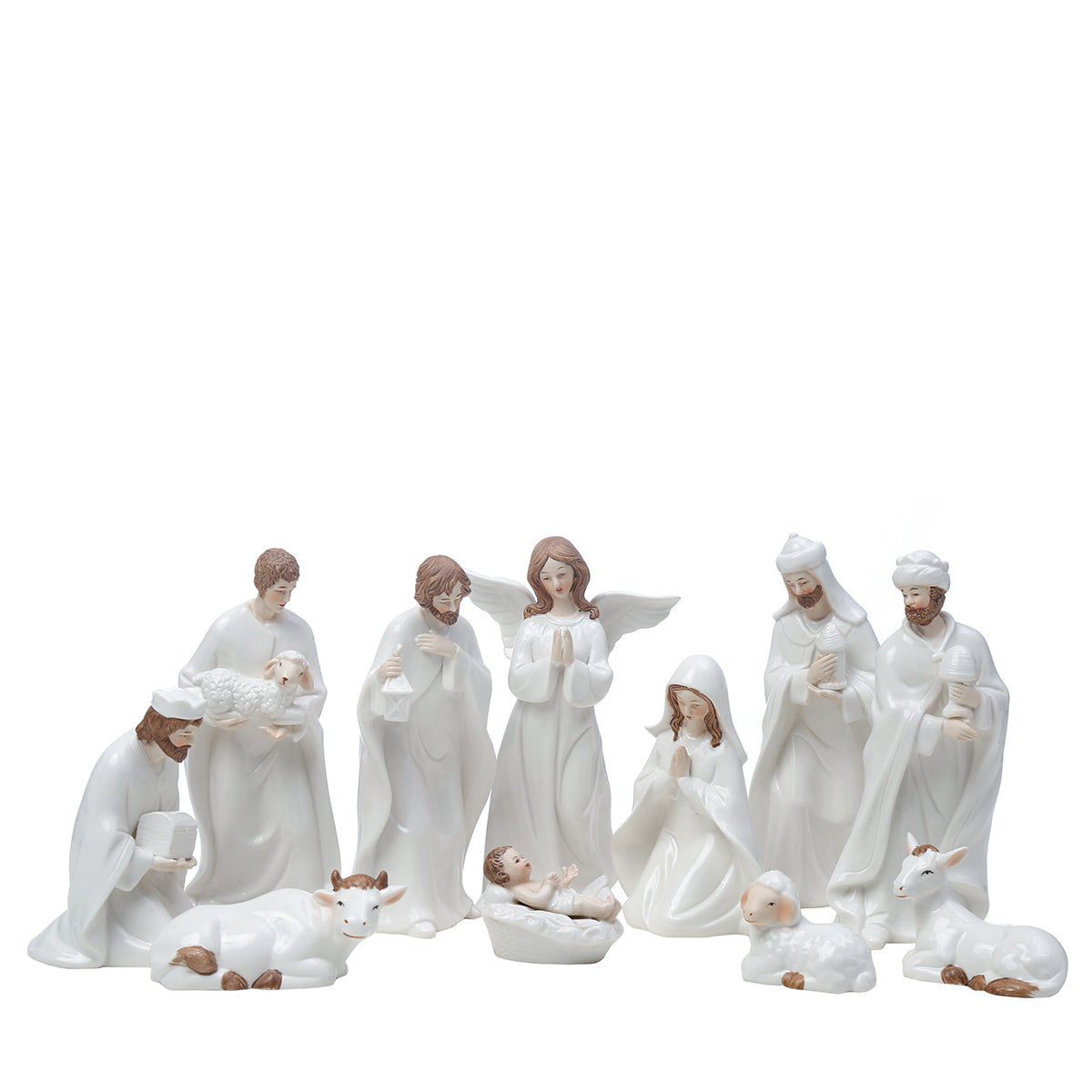 Belén navideño de porcelana blanca que incluye 11 figuras de varios tamaños con una altura máxima de 19cm. Este belén puede colocarse al pie de su árbol de Navidad, en un nicho de pared o sobre un mueble. Hecho a mano, es de gran calidad y aportará un espíritu festivo a tu decoración de fin de año. Se suministra en caja Sia ideal para guardarlo de un año para otro.