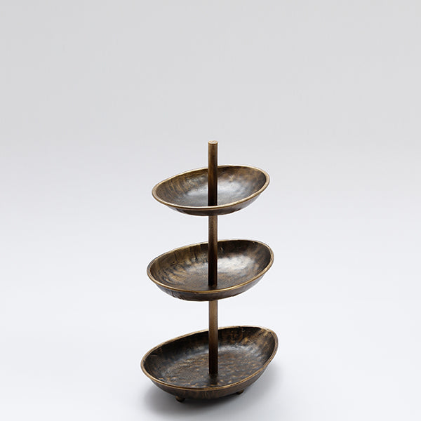 Serviteur à trois étages en métal couleur laiton. Ce serviteur à pied vous permettra de présenter des fruits artificiels, des cupcakes ou amuse-bouche (au préalable disposés sur du papier) de façon festive et élégante grâce à son design tendance et vintage. Existe en deux tailles.