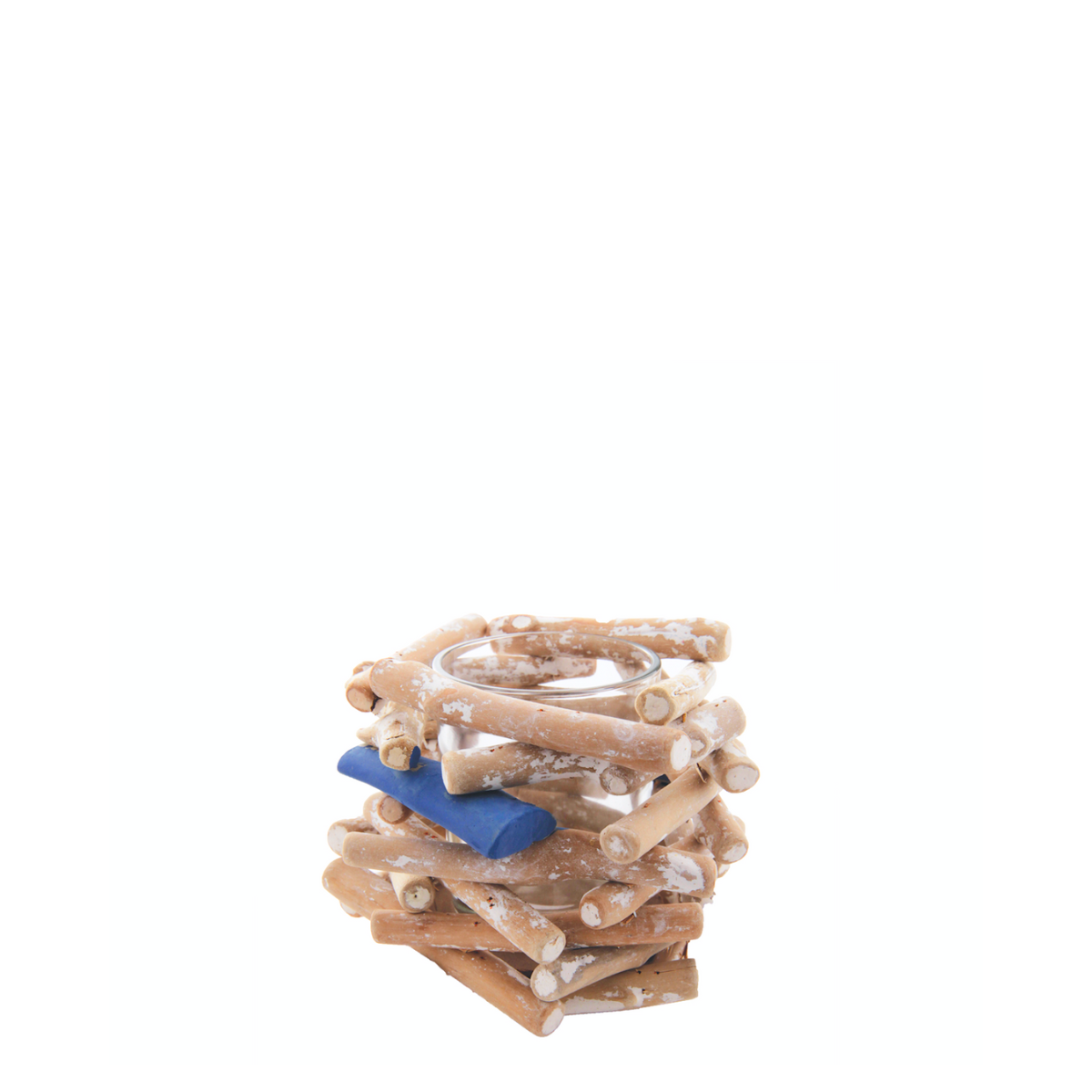Portavelas de madera seca en colores natural, blanco y azul con un interior cilíndrico de cristal para proteger y estabilizar la vela. Está hecho para colocar una vela cilíndrica en su interior. Perfecto para crear un interior limpio y natural.
