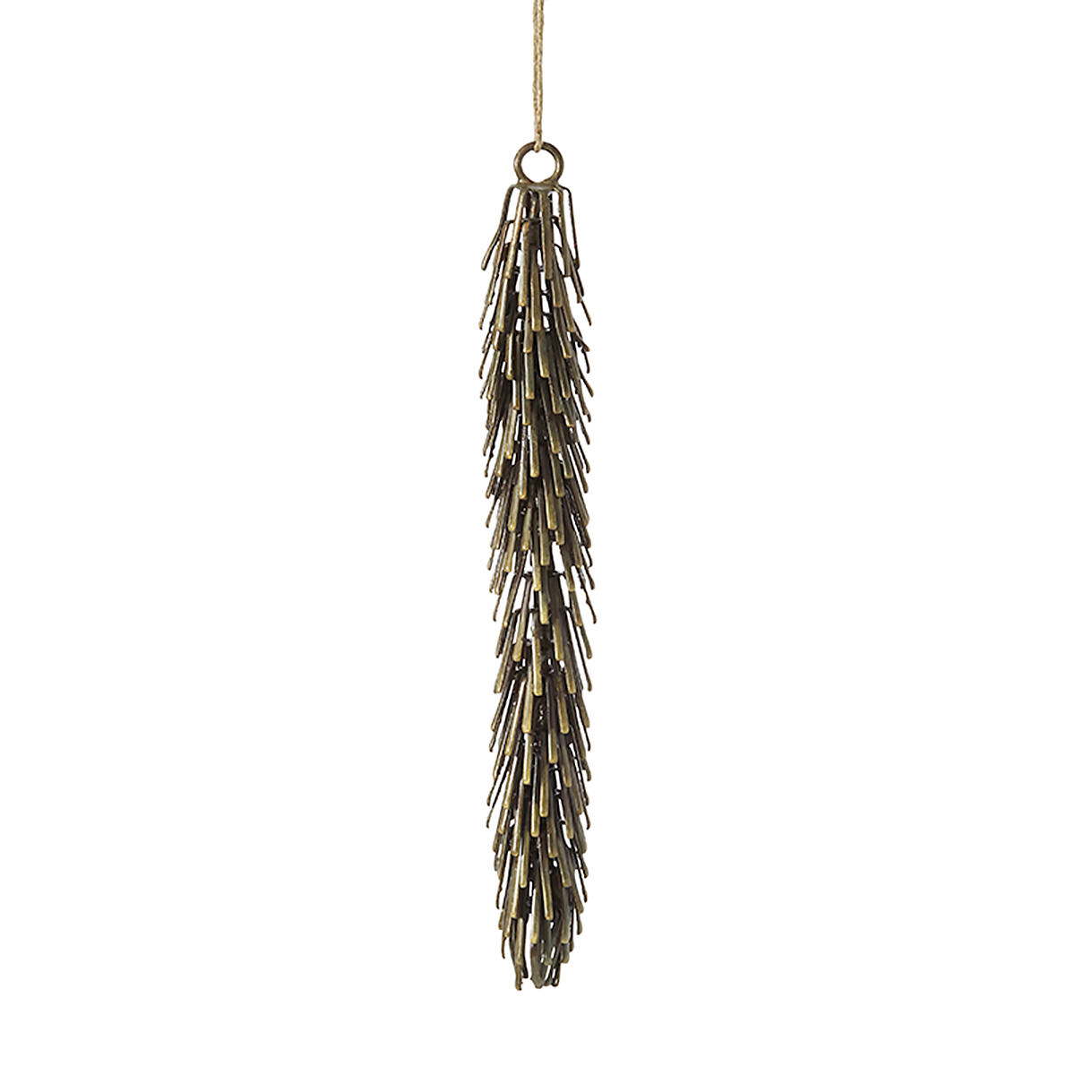 Suspension métallique en forme de pomme de pin grâce à ses fines éguilles en fer patiné effet laiton. Elle est à accrocher dans le sapin ou au plafond. Vendu à l'unité.