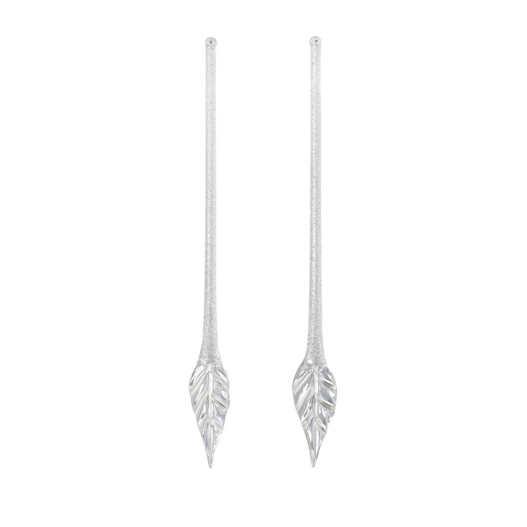 Set de 2 ornements irisés de Noël allongées en verre avec pointe en forme de feuille à accrocher dans l'arbre de Noël. Reflets multicolores très léger sur le bout de la pointe.