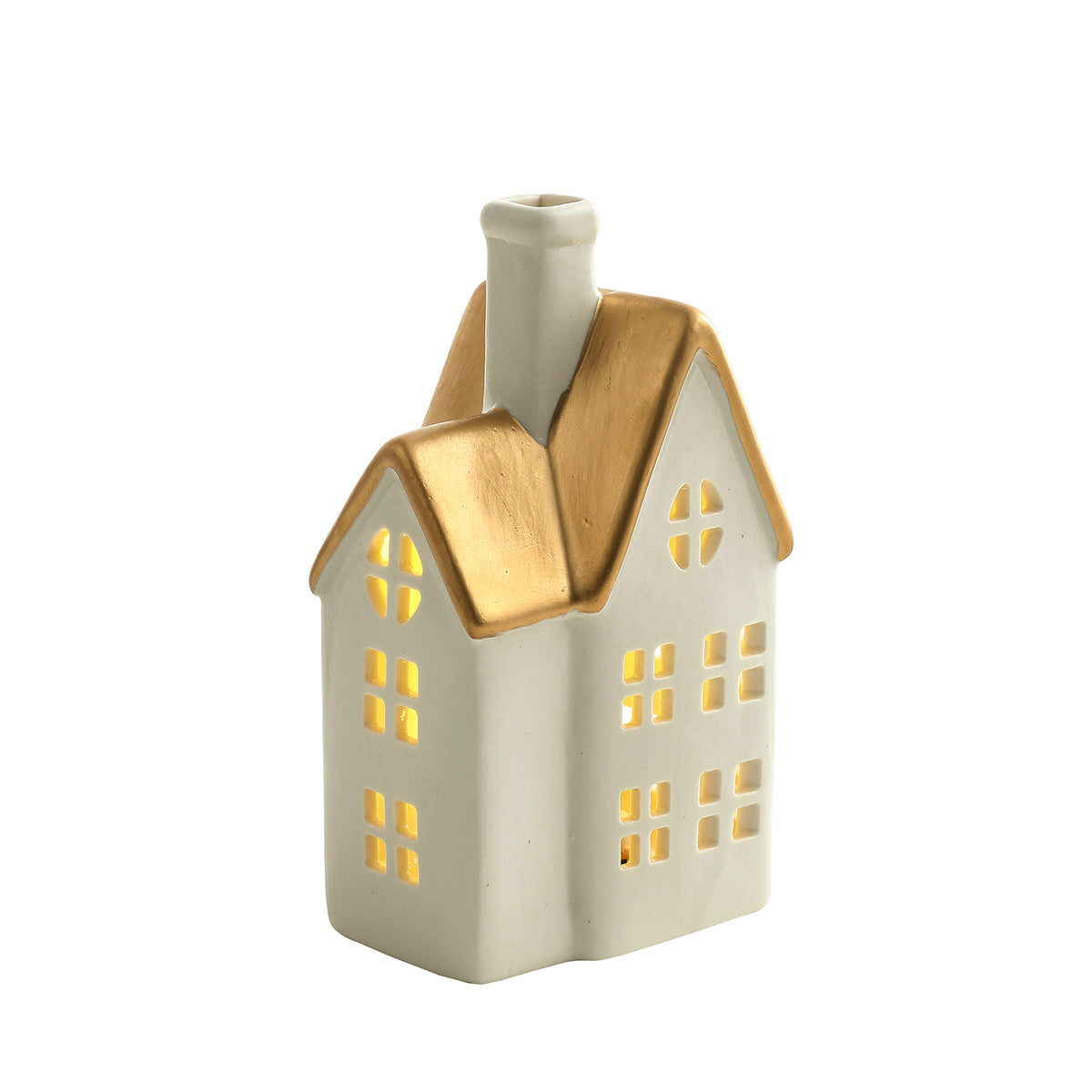 Statuina "Chalet di Natale Bianco" con tetto in oro pallido, camino, quattro finestre quadrate e una rotonda sul davanti. Questo cottage in stile moderno può essere posizionato ai piedi dell'albero di Natale, in una nicchia a muro o su un mobile. Realizzato a mano, è di alta qualità e porterà un tocco di festa alle vostre decorazioni natalizie. Combinate le diverse casette in porcellana per creare un magico villaggio natalizio.