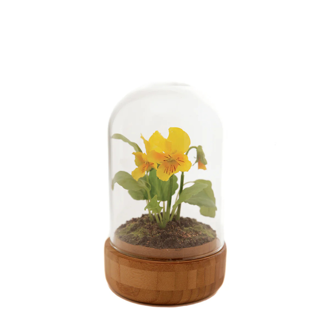 Viola sotto una cloche di vetro e fissata su una base di bambù e un letto di muschio artificiale. Ideale per decorare un ufficio o una cucina perché non richiede alcuna Cura e la sua superficie in vetro è facile da pulire. Questa composizione floreale è essenziale per un interno moderno e naturale.