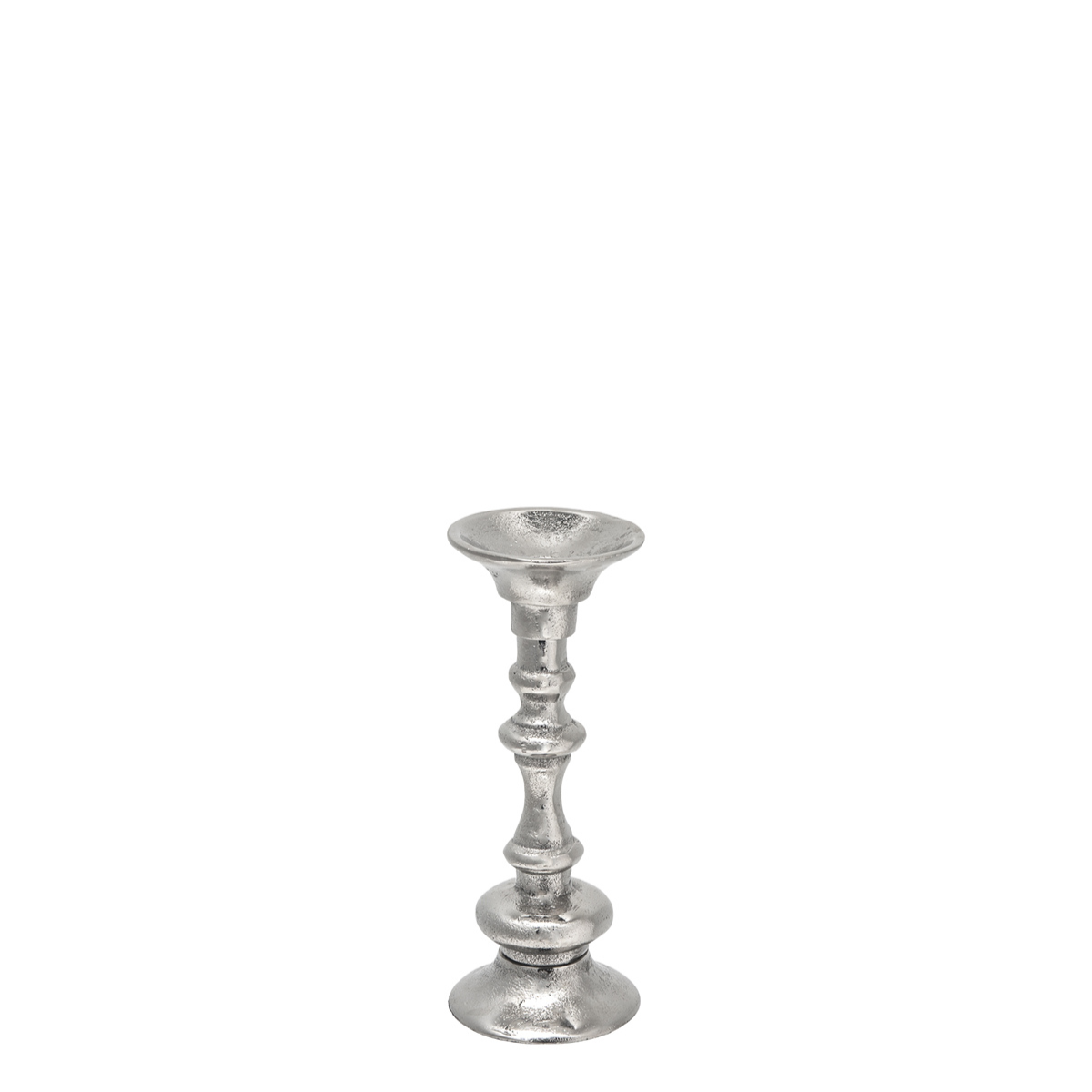 Portacandele in alluminio argentato in stile vintage. La sua forma lo rende un'aggiunta elegante e raffinata alla tavola o come elemento decorativo su una mensola. Disponibile in due diverse dimensioni.