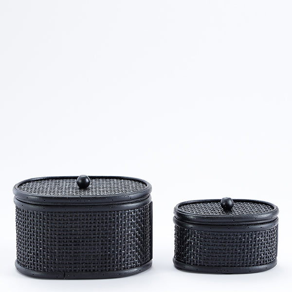 Set de 2 boîtes ovales noires. Élégantes et pratiques, ces deux boîtes ovales en bois et rotin noir arborent un raffiné motif en cannage, qui leur confère un style à la fois authentique et tendance. Leur tressage met en valeur ce savoir-faire décoratif, tandis que leur couvercle avec bouton assure une finition esthétique et fonctionnelle. Idéales pour organiser de petits objets, bijoux ou accessoires, elles se placent facilement sur une commode, une console ou une étagère. Leur design sobre et intemporel leur permet de s’adapter à tous les styles de décoration, du moderne au classique en passant par le bohème chic. Laissez-vous aussi tenter par leur version ronde.