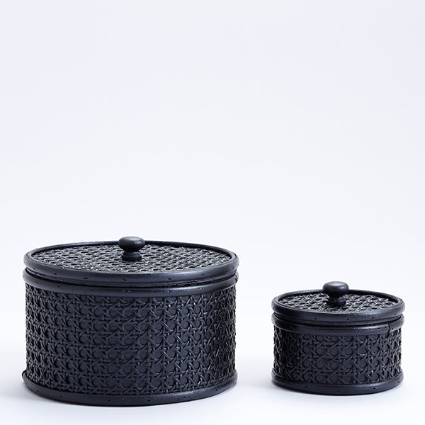 Set de 2 boîtes rondes noires. Élégantes et pratiques, ces deux boîtes rondes en bois et rotin noir arborent un raffiné motif en cannage, qui leur confère un style à la fois authentique et tendance. Leur tressage met en valeur ce savoir-faire décoratif, tandis que leur couvercle avec bouton assure une finition esthétique et fonctionnelle. Idéales pour organiser de petits objets, bijoux ou accessoires, elles se placent facilement sur une commode, une console ou une étagère. Leur design sobre et intemporel leur permet de s’adapter à tous les styles de décoration, du moderne au classique en passant par le bohème chic. Laissez-vous aussi tenter par leur version ovale.
