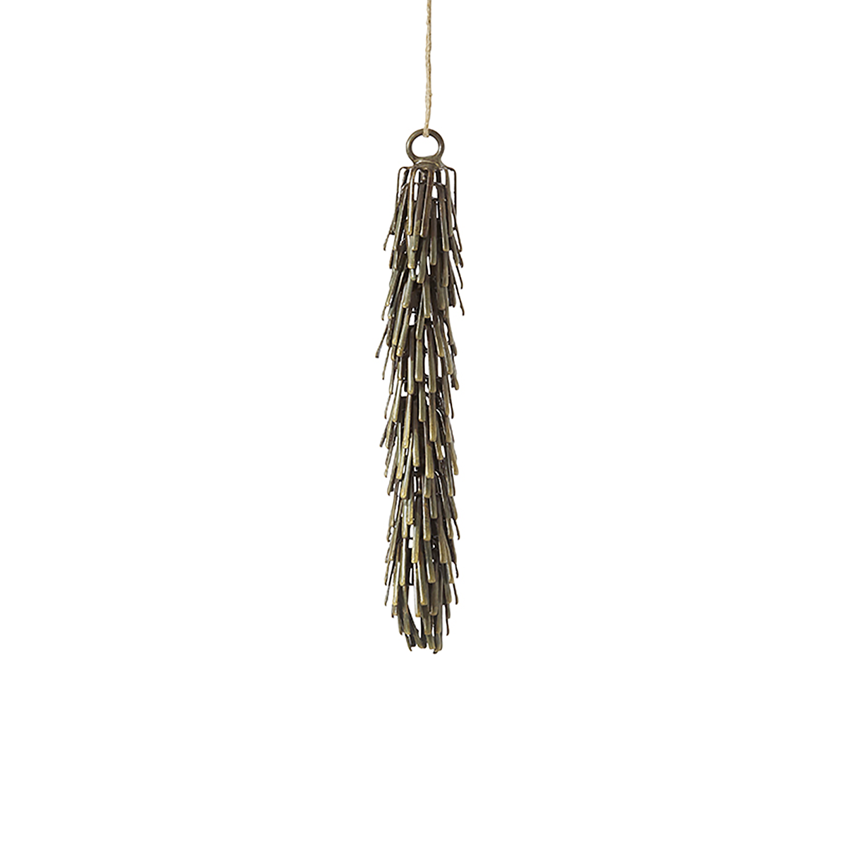 Decorazione da appendere in metallo a forma di pigna grazie ai suoi sottili aghi in ferro patinato effetto ottone. Deve essere appeso all'albero o al soffitto. Venduti singolarmente.